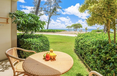 The fabulous ocean-front vistas of Suite 152 await you! 152 is as close to the beach as you can get anywhere on Kaua'i and only steps away from the water's edge. Suite 152's ground floor location (Ni'ihau Bldg) affords the best sun and moon rise views and all without stairs to climb. Your ocean front private patio leads right onto the beach. Get ready for sand between your toes and relaxation for your soul. Many of our guests come back year after year for the breathtaking views and short walk to the waves. Enjoy the many unique features and amenities of suite 152, it is one of the most unique custom units in the entire complex. DIRECT oceanfront and nothing but ocean and beautiful foliage to look at. Suite 152 will bring on that special feeling of island hospitality called aloha. Spend carefree days exploring the mystical and magical Island of Kaua'i. Dine at one of our recommended establishments or take in the fabulous lu'au at Kilohana Plantation, and every night you will return to the serenity of Suite 152 and be lulled to sleep by the sound of the surf.