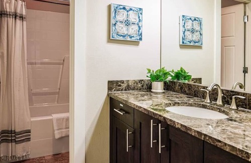 You and your guests will love spending your evenings curled up on the couches of this cozy living room. There's a gas fireplace, a big-screen TV, and even a working desk (if you need to study or catch up on emails). The living room flows seamlessly into the dining area and kitchen, so you can still mingle with others while watching the game or a movie!