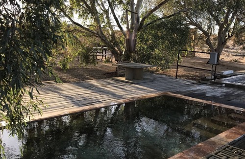 Hot springs are a rarity in the Joshua Tree area, with only a few known at private residences. The naturally hot water emerges from the ground clear, clean, and non-smelling, at 160 degrees. A desert-style, homemade system of pumps, valves and thermometers channel the 160-degree water into the small hot-tub-like pool to mix with the cool circulating mineral water, and automatically shuts off when the temperature reaches 102 degrees. The overflow from the hot pool moves to the cool pool, and the water from the cool pool moves throughout the landscape. The porcelain-tiled and cinderblock pools are surrounded by a Douglas fir deck (please wear flip flops as it can be splintery), and are shaded by 4 very large fragrant eucalyptus trees with nesting hammocks.
