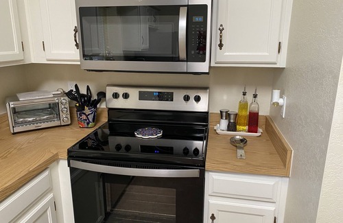 The kitchen has brand new stainless appliances and is well equipped for all of your needs.