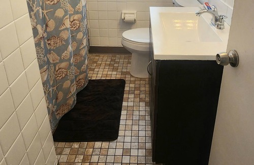 The spacious bathroom features a tub/shower combo, bathroom essentials, and Hotel-quality towels.