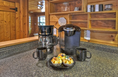 Relax on the screened porch, take a nap in the sunroom, or stretch out on the hammock while listening to the sounds of nature. Enjoy a fresh-cooked meal, a morning coffee, or an evening beverage by the creek. The cabin's great room features exposed wood, from the floors to the ceiling beams, creating a warm and inviting atmosphere. Recline on the comfy sofa, use the Wi-Fi to plan your next adventure, or challenge your kids to a video game tournament on the 65-inch flat screen TV. The cabin also offers a pool table with a view of the creek, and a fully furnished kitchen with a stainless steel oven and plenty of counter space for meal preparation.