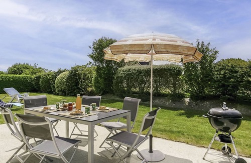 "Ker Laouen", 4-room house 100 m2. Bright, beautiful furnishings: living/dining room with dining table, satellite TV and international TV channels. Exit to the terrace. 2 rooms, each room with 1 french bed (140 cm, length 190 cm). 1 room with 2 beds (90 cm, length 190 cm). Open kitchen (oven, dishwasher, 3 induction hot plates, toaster, kettle, microwave, freezer, electric coffee machine). Bath/shower, sep. WC, double hand-basin. Electric heating, underfloor heating. Parquet floors. Terrace, south facing position. Terrace furniture, barbecue (portable), deck chairs (2). Facilities: washing machine, dryer, children's high chair, baby cot, hair dryer. Please note: non-smoking house. Smoke alarm.