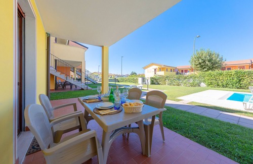 Located in the Residence "La Mimosa" with pool, close to the Lake, the beach and the city centre, a ground-floor apartment for a family or group holiday up to 6 people.The apartment, provided with free Wi-Fi, welcomes guests onto the bright living room with a comfortable sofa bed for 2, flat-screen TV, dining table with chairs, fully equipped kitchen with cooker hob, refrigerator, freezer, oven, microwave, dishwasher, electric kettle, juicer, coffee machine and toaster.The living room leads to the private covered patio through French doors, equipped with a dining table with chairs with a nice view over the garden and pool.This apartment, provided with air-conditioning in the 2 bedrooms, continues with the bathroom with shower, wash basin, bidet, WC and washing machine.Guests benefit of the master bedroom with a comfortable double bed and a spacious wardrobe, while the second bedroom is equipped with 2 single beds and a wardrobe.Guests will benefit from a covered parking slot inside the property.*La Mimosa enjoys a nice shared 16x7 meters pool, available from April 15th to October 15th. *Pets are welcome upon request with a small extra cost.*Cot and high chair available upon request, at an extra cost of 35€ per stay, per item.*Upon arrival or a few days before arrival it may be required to pay a tourist tax, which varies according to local regulations. You will find your reservation details within the Guest Area of Wonderful Italy.*Guests will collect the keys at the Welcome Point in Località Rovere 2, Desenzano del Garda, 25015.We also offer to our guests truly authentic experiences to live like a local. If interested, contact us and we will be more than happy to help you out designing an unforgettable holiday to discover Italian beauties.Peschiera del Garda is the Italian lakeside city for excellence, also called "the fortified city" due to the presence of its military fortress, declared a UNESCO World Heritage Site in 2017. The historical evidence of the city can be admired starting from the entrance to the historic center , the "Porta Verona", to continue towards the Museum of the Historic Building, with frescoes dating back to 900. Peschiera also offers wonderful beaches and amusement parks such as the famous "Gardaland", easily reachable in 20 minutes by shuttle from the train station of Peschiera, otherwise in just 10 minutes by car.The airport of Verona can be reached with a 10-minute drive.