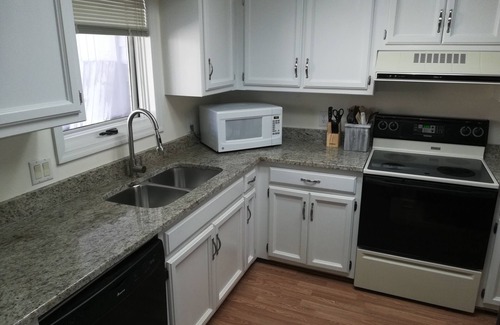 four to six guests can stay in comfort in this updated home king bed, queen bed (along with 2 blow up queen mattress available for larger families) with a well-stocked kitchen, 2 large bedrooms, 2 full bathrooms. Living room boasts a 65" Smart TV w/ cable, DVR, Blu-Ray players in all the rooms (43" TVs in each bedrooms) Each bedroom has cable TV and blu-ray players for your streaming pleasure (Netflix, Hulu, Amazon prime, etc).