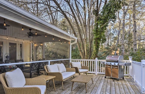 OUTDOOR LIVING: Private dock w/ 2 kayaks & 1 canoe, screened-in porch w/ ceiling fans & dining table, porch w/ Weber gas grill & cushioned seating, patio w/ hammock & porch swing, private yard, fire pit