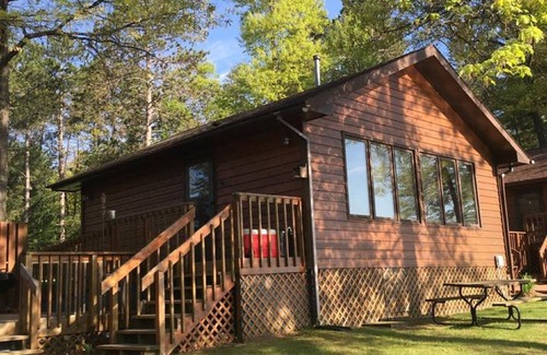 Breezy Bay is a lakefront cabin offering 2 bedrooms (bedroom 1 has double bed, bedroom 2 has adult style bunk beds - single on top and double on lower with memory foam mattress). 1 Bath, living room, kitchen combination. Living room has queen pull out sleeper sofa. Large patio area with Weber grill, picnic table, fire pit, pier, Cable TV, DVD player with movies, boombox player with CDs. Sandy beach with raft. Playground, basketball court. Interior updates with northwoods feel. Walk to Windmill Ice Cream Shop summer season. Walk to Billy Bob's Sports Pub. Nice calm bay for swimming or waterskiing. Great morning sun. Year round.