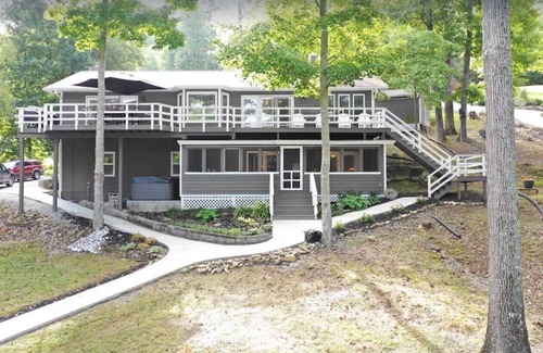 Located in a private deep water cove just off the main channel (point #6) with majestic views of Norris Lake and the surrounding mountains! A very comfortable 3,200+ sq/ft modern home that features a sunset luxury dock, 5 bedrooms, 3.5 baths, 1+ acres of fun outdoor space with custom constructed fire pit, shuffleboard, & cornhole; open concept kitchen with a standalone commercial grade ice maker, dining and living areas overlooking the lake with direct walk access to the large sun deck with a screened in porch below. Emerald Waters is your vacation home away from home!