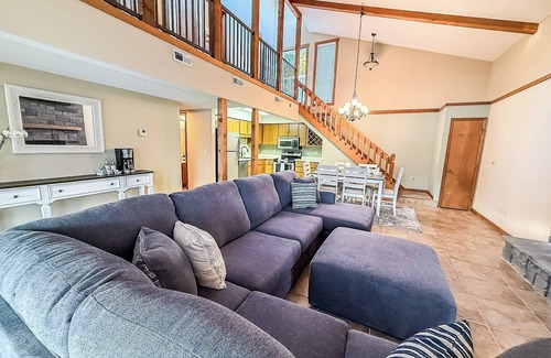 The lower level is ideal for group hangouts and includes another large bedroom with a full-size bed and two twin beds, plus another full bathroom. You’ll love the open-concept kitchen, dining, and living room that makes hosting a breeze, whether you're cooking up a meal, playing games, or enjoying movie night on the Smart TV with WiFi.