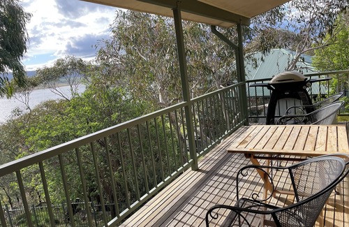 A lovely house in Tyrolean Village with Lake Jindabyne frontage, and spectacular views over Jindabyne and the mountains. Beautiful walks and beaches, 5 minutes drive from Jindabyne, 30 minutes to the ski resorts.