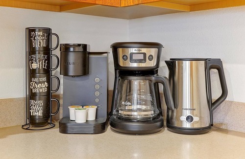 The Kitchen features stainless steel appliances, a breakfast table & breakfast bar with seating totaling up to 8! The kitchen is equipped with everything you should need, including cutlery (silverware) & plasticware for the pool deck, pots & pans and everything else you'll need to have a fantastic and comfortable vacation! Toaster, blender, coffee maker and microware are provided.
