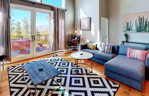 A wraparound deck features a private hot tub, breathtaking mountain views, and an ideal spot for alfresco meals. Inside you’ll find gleaming hardwood floors in the common areas, high ceilings, high-end furnishings, and new appliances. This spacious retreat is ideal for social distancing.