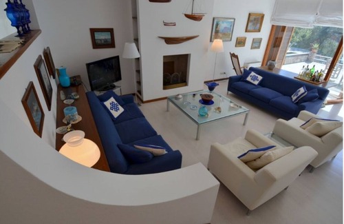 Villa Le Rocce, From late spring through early fall Elba, the main Tuscan Island is an extremlely attractive location to visit. With the beautiful, crystalline sea as main attraction, it can also offer classic Tuscan countryside sights with vineyards, cypress and pine trees, making the landscape a unique scenery. Capoliveri, placed on top of a hill with breathtaking sea-views and surrounded by fortified walls, is one of the most interesting corners on the Island. Once an Etruscan fortress, the village is nowadays a jewel rich in nice restaurants, cafes and several craft shops. During summer time it also offers plenty of interesting events like concerts, markets and eno-gastronomic appointments. Madonna delle Grazie lays just under Capoliveri, on an amazing panoramic position in front of the beautiful gulf and above the beach from which it takes the name. From any point on the lovely terraced garden the views are enchanting and the several relaxing and shaded outdoor areas have been created to provide little oasis where to sink into oblivion. The remarkable swimming pool has been placed in one of the most panoramic points and its infinity end side gives the idea of simply being in the middle of the sea. The house is furnished in a smart yet sober marine style, with the particular feature of large French windows opening on to the terraces and garden which gives an idea of continuity with the outside. The accommodation is made of a main house and an extra apartment, on a lower level, giving the opportunity to a large group to retain some independence. A completely private access (made of steps) leads to the sea, where a nice covered platform has been installed and furnished to recover from the sun during the hottest days. At short distance is also possible to discover the pretty famous sandy beach called "Innamorata", a magic half-moon between rocky green hills and the beautiful sea. The caretakers live on the premises in an apartment with a separate entrance and are available for extra services.