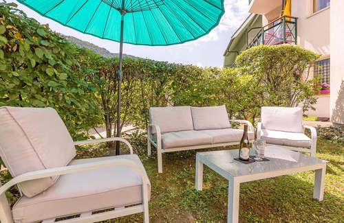 Located on the ground floor, the apartment offers an exceptional setting just 40 meters from the lake, with stunning views of the surrounding mountains. Facing east, the private garden enjoys beautiful morning sunshine, perfect for breakfast on the furnished terrace.