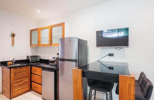 The apartment has one private Bedroom with a queen size bed, large closet with sliding mirrored doors, fully air conditioned, one full bathroom with new glass showers and tile floors, Living Room with a double size sofa. Equipped kitchen with range, refrigerator, stainless kitchen sink, and sitting for up to four people, and a programmable safe for your possessions. This apartment is located on the second story of the newly built boutique apartment building.