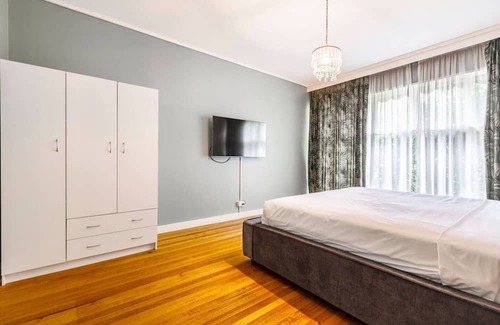 Rest easy at night with comfortable and spacious bedrooms to retreat into. Two queen bedrooms are decorated in chic filigree wallpaper and divine chandeliers plus wall-mounted TVs to enjoy movies in bed. The third bedroom is ideal for kids with a double bed and a tri-bunk bed. The bathroom boasts a retro character with cool monochrome tiles against pastel pink and yellow tones. Soak in the bath or shower and keep cosy with the heated towel rails. Additional conveniences include a laundry and easy driveway parking.