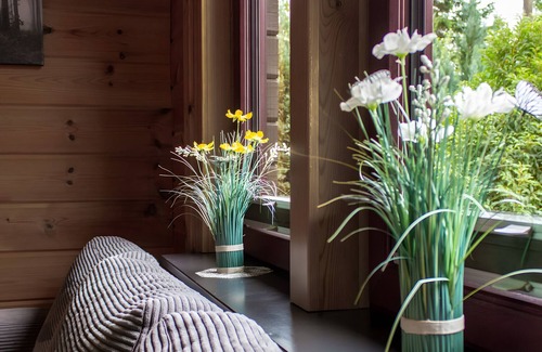 The Finnish log cabin promises a unique holiday atmosphere. Surrounded by nature and directly adjacent to the premium hiking trail Himmerod-Schleife, you enjoy peace and relaxation. A fully equipped kitchen, a spacious bathroom with shower and bathtub, as well as plenty of space to feel comfortable and unwind, complete the living area. Free Wi-Fi, a DAB-capable radio, and a total of three flat-screen TVs ensure that you always stay up to date if you wish. The generous box spring beds provide restful sleep. The house features a large photovoltaic system with storage and is connected to the heat and power network with the neighboring house. Heat is primarily supplied via the heat pump in the neighboring house, which is powered by the photovoltaic system. This ensures largely autonomous heating and energy supply, including the wallbox in the guest house. The outdoor area, with about 2000 sqm of well-kept lawn, invites families to play, barbecue, and enjoy. Sunny and shady spots for relaxation are always available.