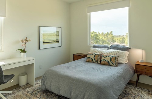 This 4-bedroom, 2.5 bathroom contemporary home is located on 2.5 serene acres in the La Tierra area off of Route 599, close to town, the opera, and the bypass road to Albuquerque. Plenty of hiking and biking trails nearby make this home an outdoors-person's dream. With large 10x12' glazed pocket doors in the main living area, this house provides an incomparable indoor-outdoor experience. Currently furnished with beds in two of the bedrooms and the other two bedrooms set up, respectively, as an office and den, owners will provide additional beds if renters require. Looking for a one-year lease ideally, starting mid-September to mid-October and will consider shorter stays of one-month minimum, depending on timing. Lovely outdoor sitting/lounging/dining areas enhance indoor/outdoor living.