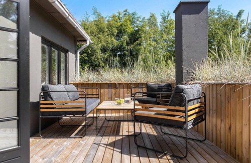Spend your holiday in this tastefully designed holiday home on the island of Langeland, just a few minutes' walk from the beach. Here you will find peace, comfort and plenty of opportunities to relax, both indoors and outdoors. The bright, modern and cosy interior boasts clean lines, natural materials and stylish details. The open-plan living area with wood-burning stove invites you to spend cosy evenings reading a book on the sofa or eating together at the dining table. The practical kitchen offers you the opportunity to cook together. Let your gaze wander through the large windows into the green garden or use the cosy windowsill as a reading corner.