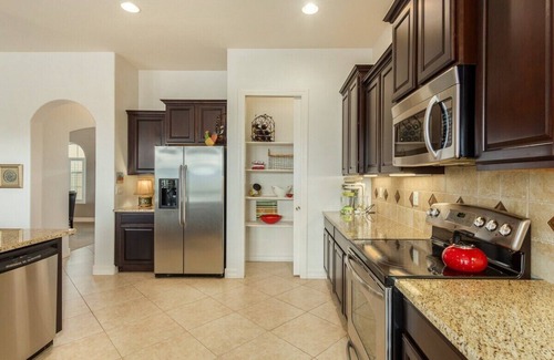 Awaiting your culinary adventures is a kitchen equipped with granite countertops, a large central island illuminated by chic pendant lights, a walk-in pantry, and top-of-the-line stainless steel appliances. The kitchen is a chef's dream with plenty of cabinet space and more, and it comes fully stocked with everything you need to prepare a gourmet meal or create vacation-worthy drinks, including a dedicated Margaritaville margarita machine for the ultimate poolside indulgence.
