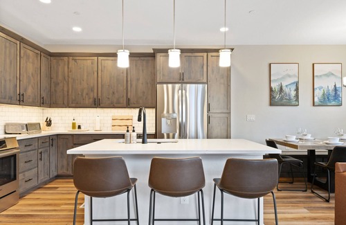 Spanning over 2,500 square feet, this spacious chalet features four beautifully appointed bedrooms and 4.5 bathrooms, accommodating up to 10 guests comfortably. The master suite boasts a king-sized bed, while the additional bedrooms include a mix of king, queen, and twin bunk bed arrangements, ensuring everyone has a cozy place to rest after a day of adventure.