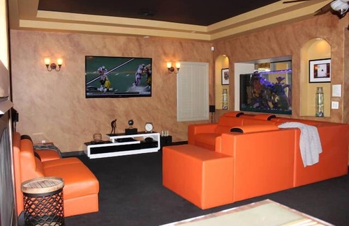 This grand 4,000 plus sq. ft. home features 4 bedrooms w/individual bathrooms, gourmet kitchen, media room w/70" TV, 40" flat screen TVs in bedrooms, poker table, pool table, and washer & dryer. A 5th "Honeymoon Suite" BR available for an additional charge. The feel of a Las Vegas Strip 5 Star hotel, without the hassle. Located 20 minutes from the heart of the Strip and 10 minutes from Downtown Freemont area. Quiet cul-de-sac neighborhood featuring gorgeous mountain views.