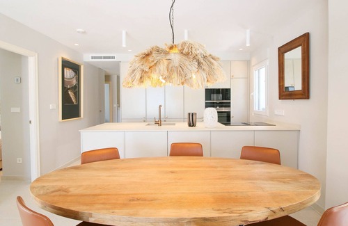 This impressive villa is located on the first line of Las Marinas beach in Denia in a quiet area, very close to the urban centre. The house has been completely renovated and redecorated in 2024, with exquisite taste and great attention to detail. Its capacity is for 6 people, as it has three bedrooms (two of them en suite) and three bathrooms. The accommodation has wifi and air-to-water heating/cooling throughout the house.The beautiful garden and pool are particularly striking, very different from what is usually found. For the use and enjoyment of our clients, sunbeds and outdoor furniture (chairs, tables and chill-out area) are available.Upon entering the property, we find ourselves in the living/dining room with an American kitchen, from which beautiful views of the garden and the sea can be enjoyed. The kitchen is fully equipped with: induction, refrigerator, microwave, oven, freezer, dishwasher, crockery/cutlery, kitchen utensils, coffee maker, toaster, kettle and juicer.Next to it is the first bedroom with two 90cm beds. Following the corridor, there is a bathroom with a shower. Next to it are the other two double bedrooms, both with en-suite bathrooms. One of them also has an outdoor exit and TV.Surrounding the villa is a small, very pleasant courtyard where you can have breakfast in the mornings.The parking area is located in front of the property, it is private but shared with another villa. The upper floor of the villa is private, only the ground floor is rented.Heating consumption (Gas, Oil or Pellets) is not included. In long-stay rates, electricity and heating (Gas, Oil or Pellets) are not included, nor is WiFi, sheets or towels. The price of services will be according to the agency's conditions.