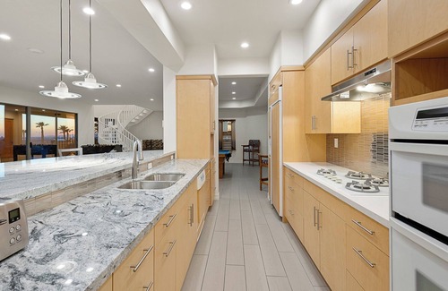 Inside, massive picture windows bring the outdoors in—flooding the home with natural light and stunning views. Two fully stocked kitchens make mealtime a breeze, while a private theater, billiards table, and multiple lounge areas ensure everyone has space to play, connect, or recharge.