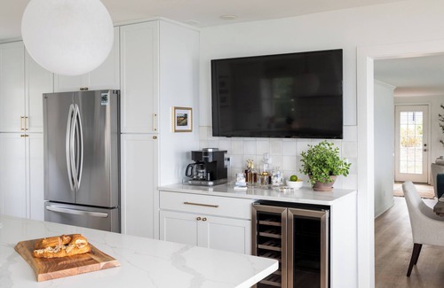 Enjoy cooking up a storm in the gorgeous, newly renovated kitchen! The kitchen was designed to allow everyone to gather together, which usually happens anyway. Your head chef will enjoy turning out delights in this chef's kitchen filled with natural light, loads of counter space, an 88" island and a 36" stove for cooking. The island seats 4-5, plus 3 at the bistro table. Enjoy the 7' window seat to watch the lake, hang with the gang, or move the table for more seating. There is a full beverage station with a beverage refrigerator, a well-stocked coffee and tea station, and a Smart TV for playing today's can't miss game. Wake up early and enjoy your first cup of coffee with the breath-taking lake views of Crystal Lake.