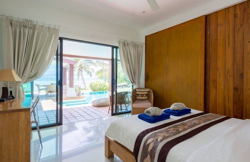 Thai style modern villa by a sandy beach with garden facing the bay of Nathon , the 7 islands and the mountains of the continent to enjoy the wonderful variations of colors of the sea and sky. Incredible sunset view.