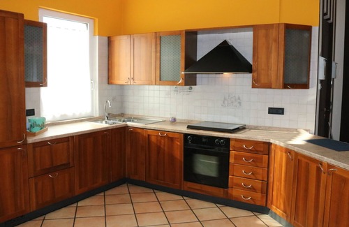 4-room apartment on 1st floor. Beautiful furnishings: upper floor: (exterior staircase) large living/dining room with open-hearth fireplace, dining table and satellite TV. Exit to the balcony. 1 double bedroom. 1 room with 2 beds. 1 room with 1 sofabed. Open kitchen (oven, dishwasher, 4 ceramic glass hob hotplates, freezer). Shower/bidet/WC. Gas heating (extra). Balcony, large garden. Terrace furniture, barbecue, covered balcony. Facilities: washing machine. Internet (WiFi, free). Parking (fenced 2 cars) at the house. IT023043B4N9X9UKRM