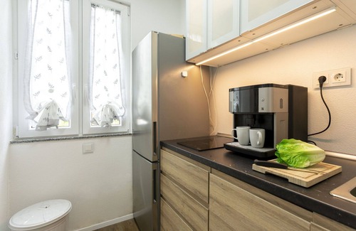 The apartment features a modern, fully equipped kitchen, perfect for preparing delicious meals, and a large bathroom equipped with a washing machine.
