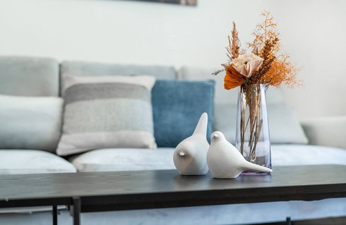 Step inside and discover a world of color, warmth, and style. The apartment features a bright open living area, tasteful décor, and unique artistic touches that create a welcoming, high-end atmosphere.