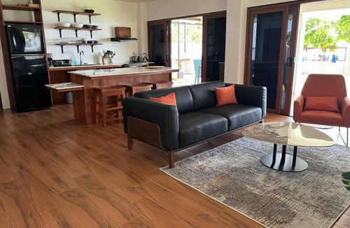 The living room features seating for six, a Smart TV, and an additional Smart TV in the downstairs bedroom. The entire house is equipped with fast and reliable Wi-Fi via Starlink, and inverter air conditioning in all bedrooms and in the living room/kitchen for quiet, energy-efficient cooling.