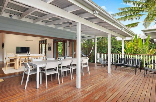 Unwind in one of the home's hammocks, or recline on the spectacular timber-decked wraparound verandah while enjoying views of the surrounding trees and tropical gardens. The rear of the property features a BBQ area with an 8-seater dining table – ideal for alfresco dining during warmer months.
