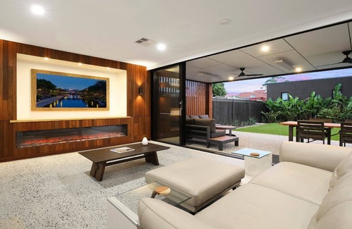 * Open plan living space with wall mounted smart TV, Bluetooth speaker, electric fireplace, polished concrete floors