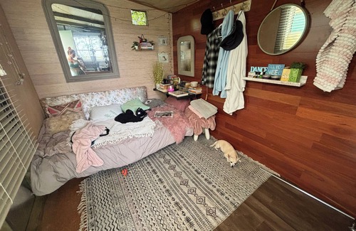 A small cabin with a kitchen and shower. No electricity but has hot water. Battery fairy lights are connected. Secure with gate. Great glamping experience and can add tents if you need or want. Has a gas cooker but no fridge.