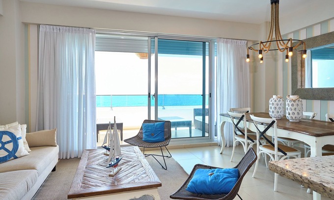 The modern apartment offers everything you could ask for in a vacation home; from modern, contemporary and comfortable bedrooms, living room, dining room and kitchen to spacious outdoor balcony with sea and pool views - on the 6th floor of a beachside building of one of the most beautiful beach resort.
