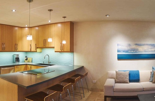 Travertine floors give the unit a warm beach vibe contrasting the soothing ocean tones and surf décor. The hand plastered walls are decorated with beautiful original oil paintings depicting Maui's ocean seascapes.