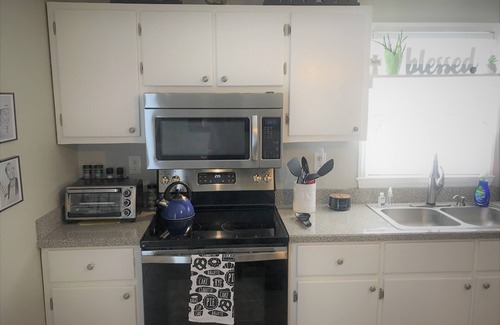 3 blocks walk to the Mayberry Courthouse and Wally's Service Station from the Andy Griffith Show, 7 blocks to downtown Mayberry/Mount Airy. Large front porch with swing and comfortable chairs, 2 BR home- KING AND QUEEN, large kitchen all w/SS full size appliances and kitchen amenities, beautiful new modern decor, new 55" TV, WIFI throughout home, full work desk w/new Lazy boy chair, setup for remote working with all the amenities of home. New paint inside and outside and new decor throughout in Fall 2021. Home just remodeled for Airbnb.