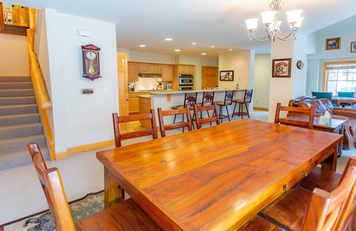 The spacious great room game table next to the fireplace, provides space for all 8 guests to play poker, cards and table pool. The large kitchen overlooking the living/dining areas includes all amenities needed for the chef in your group to cook and be part of the fun. Main level includes the living space, a primary bedroom with en-suite and powder room. Upstairs is a second primary bedroom with en-suite and private patio along with a loft area. Loft has two twin beds and desk area, making it the ideal space for any remote working or learning while on vacation. Mountain style furnishings enhance the feeling of being in a ski resort any time of year and getting away from it all. The bright light and views from all windows on the third story condo keeps the outdoors close.