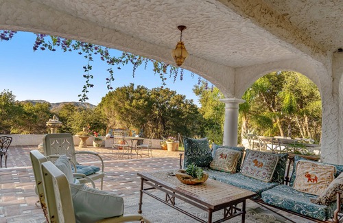 Set on three acres of magical sacred land, this estate provides roughly 4,000 square feet of relaxed, Malibu boho-chic living space. The real crown jewel is the resort-style outdoor entertaining paradise surrounded by lush landscapes and breathtaking views. There is an outdoor pool with an attached pool spa, an infinity Zen yoga deck with mats and blocks for morning practice, Mediterranean patios with Positano Italian benches plus several outdoor dining areas (over three dozen exterior dining chairs are provided for large groups), a large deck with twinkling string lights and a Ping-Pong table, two grilling areas, and an extensive lawn with a hammock.