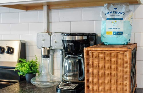 Back at the residence, the welcoming interior is the perfect space to relax and unwind during your downtime between adventures, curated with stylish furnishings and chic décor to maximize your experience. Curl up on the soft sofa or checkered armchair while you stream that new movie you’ve been saving on the mounted smart TV. Steps away, the fully equipped kitchen will have you whipping up homemade meals in no time, complete with stainless steel appliances, stone countertops, and sleek white cabinetry. Take your morning coffee at the café table for 2 while 3 high-top stools at the counter allow for dining in a setting as casual or formal as you desire.