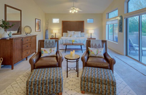 SWEET MESA LIVING, our 4200+ square foot, 2 story home has 6 bedrooms, sleeps 14 and features a backyard with resort amenities. Languish in the lagoon pool with optional heating for year round dips, or the divine private hot tub. There is a large covered patio, built-in gas grill, propane fire pit and green space with croquet and corn hole games. The sunset and mountain views are alive with brilliant colors.
