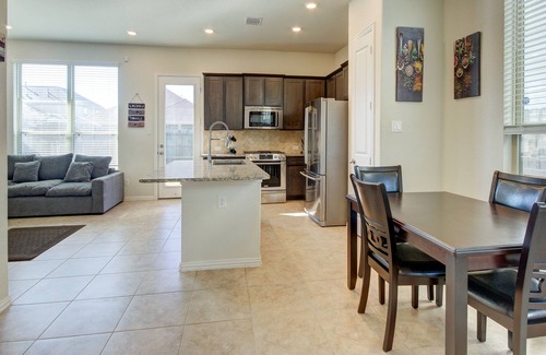 This Luxury Family Friendly 3-bedroom and 3-bathroom home, with a peaceful neighborhood, covers an area of 1557 Sqft. The first floor includes a living room, dining area, and a full kitchen. The second floor includes all 3 bedrooms and a primary bathroom. Bedrooms have two queen beds, two full beds and a king bed w/ comfortable mattresses and pillows. Each bathroom has double sinks, a separate shower, and a soaking tub. The kitchen is fully equipped (includes a dishwasher, cooking utensils, pots & pans, spoons & forks, knives, microwave oven, toaster, ice maker, gas stove, coffee maker, spices, refrigerator, dishware, and flatware).
