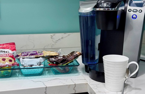 The Kitchen features Italian high gloss contemporary cabinets. An Induction Range & Oven, Microwave, Bosch Dishwasher and Fridge. It is fully stocked for cooking and has a kettle and toaster. We provide Bone China Dinnerware, silverware, glasses and even spices. Keurig coffee machine with pods, creamers, sweeteners and an assortment of snacks.