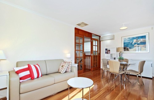 This elegant two-bedroom holiday home, within walking distance of the gorgeous Moana beach, will exceed your expectations for comfort, location and facilities. Downstairs is a lovely open-plan living, dining and kitchen area with reverse-cycle air-conditioning, large chaise lounge, TV and DVD (with numerous DVDs) and a six-seater dining table. The kitchen is fully equipped and adjacent to the kitchen is a second bathroom with toilet and shower. The dining room opens out onto an expansive, all-weather outdoor entertaining area with BBQ and outdoor seating for casual alfresco dining on those warm summer evenings.
