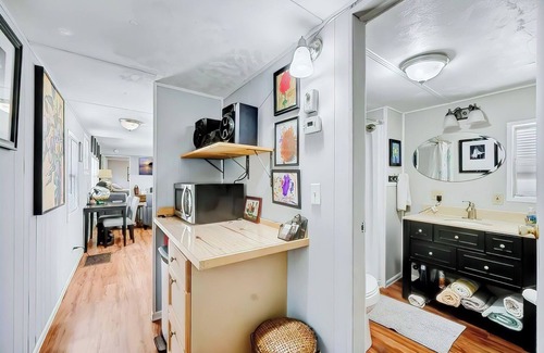 This inviting mobile home boasts 2 bedrooms and 1.5 bathrooms with WIFI included and 2 TV's with Roku access, where you can access your favorite streaming apps. On this open concept home we display a fully equipped kitchen featuring a stainless-steel oven/range, refrigerator, and microwave.