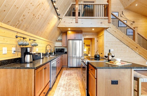 Perfect getaway at this stunning A-Frame chalet in Bethel! Sleeps 12, this modern retreat offers endless fun with Ms. Pacman, Golden Tee, and an air hockey/ping pong table. Relax in the private hot tub or gather around the fire pit after exploring or skiing at Sunday River. The spacious interior boasts 4 bedrooms, 2 primary suites, a cozy fireplace, a wide-open kitchen, and a dedicated workspace!
