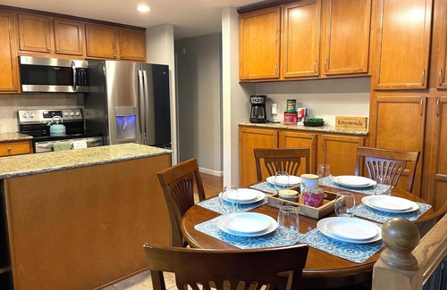 Inside, the main level boasts 2 bedrooms, a full bathroom, and a bright living room complete with a large smart TV for entertainment. Whip up delicious meals in the fully equipped kitchen, and enjoy your meals in the open dining area.